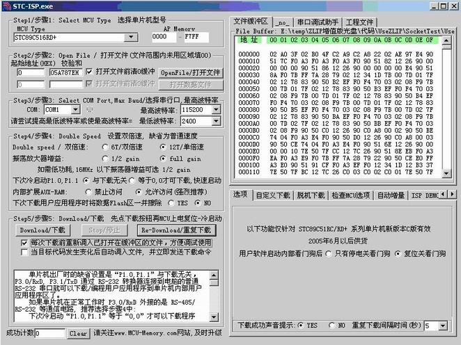 3. 下載:編譯完成后將在“\代碼\ UseZLIP \SocketTest \”目錄下產(chǎn)生UseZLIPLib.hex文件。運(yùn)行“\工具\(yùn)stc_isp_v3.91\STC-ISP