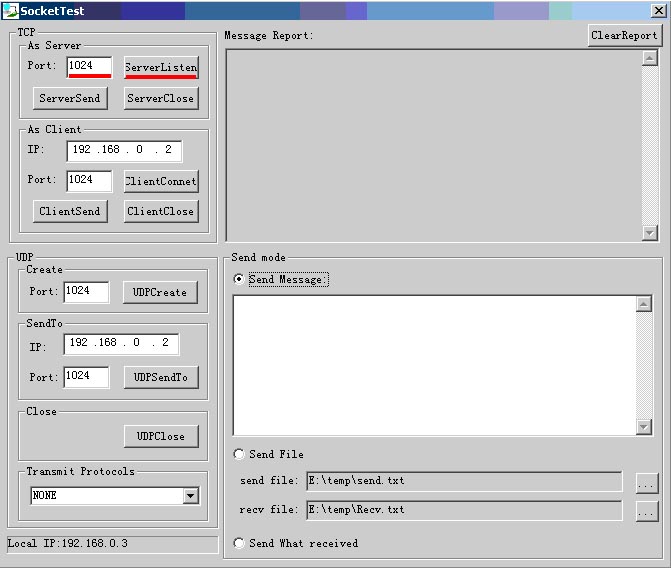 mode選擇Send Message,在Send Message框中輸入需要發(fā)送的數(shù)據(jù),點(diǎn)擊“ServerSend”,將數(shù)據(jù)(例如abc)發(fā)送給這兩個TCP連接。之后馬上收到兩個TCP連接的反饋數(shù)據(jù)。SocketTestDlg提示信息如下: