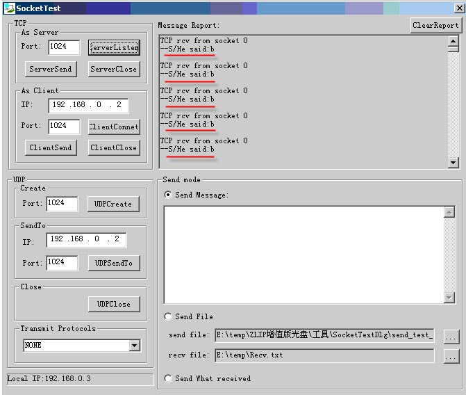 3. 再運行一個SocketTestDlg實例,向192.168.0.2:1024端口連接。之后使用ClientSend發(fā)送一個文件給開發(fā)板。發(fā)送完畢以后使用ClientClose關閉連接。通過SocketTestDlg輸出的校驗和和串口輸出的校驗和可以確定文件發(fā)送無誤。