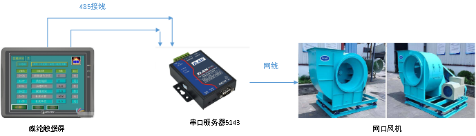 風(fēng)機是量大面廣的通用性設(shè)備,廣泛用于工廠、礦井、隧道、冷卻塔、車輛、船舶和建筑物的通風(fēng)、排塵和冷卻;鍋爐和工業(yè)爐窯的通風(fēng)和引風(fēng);空氣調(diào)節(jié)設(shè)備和家用電器設(shè)備中的冷卻和通風(fēng);谷物的烘干和選送;風(fēng)洞風(fēng)源和氣墊船的充氣和推進(jìn)。本次案例主要介紹威綸觸摸屏通過串口服務(wù)