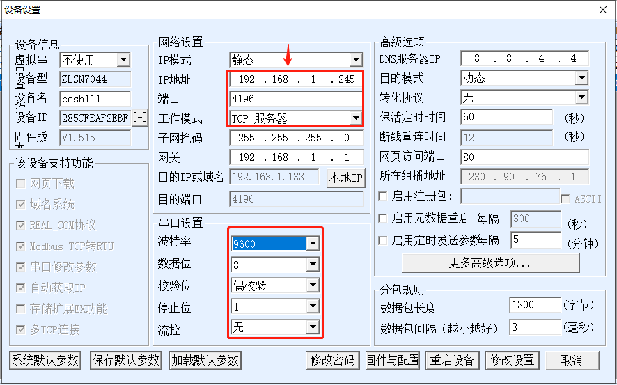 1.打開ZLvircom軟件,點(diǎn)擊設(shè)備管理,點(diǎn)擊自動(dòng)搜索,搜到后點(diǎn)擊編輯參數(shù)。首先把設(shè)備IP地址和接入的局域網(wǎng)設(shè)置同一個(gè)網(wǎng)段,工作模式服務(wù)器模式,串口參數(shù)和電表設(shè)置成一致,如圖2。