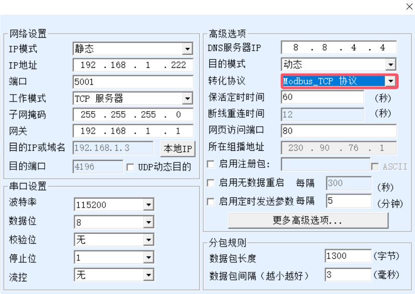 然后點(diǎn)擊“更多高級(jí)選項(xiàng)”,在“Modbus RTU或者ASCII”中選擇Modbus ASCII: