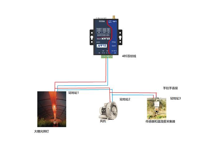 1.大棚端將lora網(wǎng)關(guān)通過485雙絞線和大棚內(nèi)的485串口儀表,采集器和風(fēng)機等設(shè)備手拉手連接。
