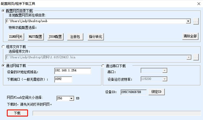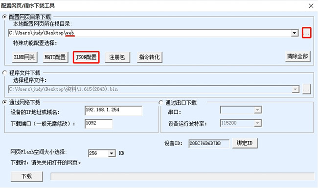 將設(shè)備IP設(shè)置和電腦同網(wǎng)段。然后桌面新建一個(gè)空白的web文件夾。點(diǎn)擊固件與配置后,選中這個(gè)web文件夾。點(diǎn)擊JSON配置。