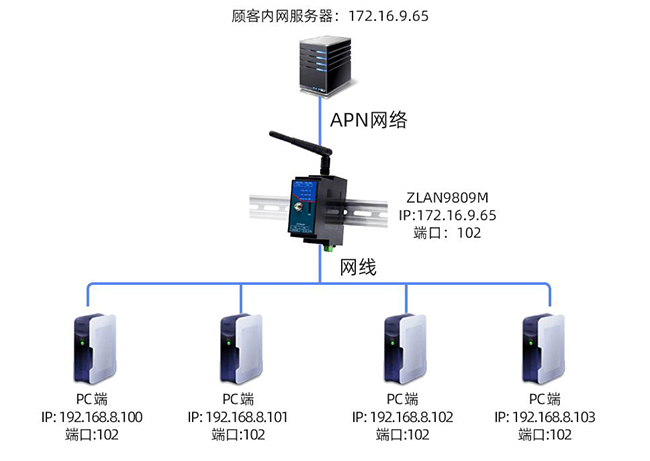 現(xiàn)在是顧客想用的功能,通過ZLAN9809M插入apn???,通過卡本身提供的固定的ip與端口,在做端口轉(zhuǎn)發(fā),從而實現(xiàn)內(nèi)網(wǎng)服務器直接訪問到下面4臺pc端。