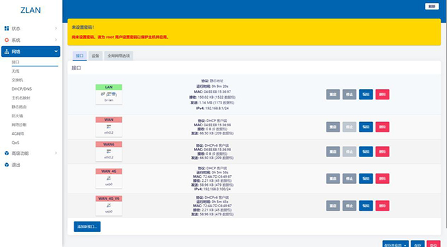 第一步:點擊左側(cè)菜單欄:網(wǎng)絡——接口——WAN_4G——IPv4已經(jīng)獲取到172.16.9.65的ip,要是獲取到是192開頭的,點擊重啟就好了。