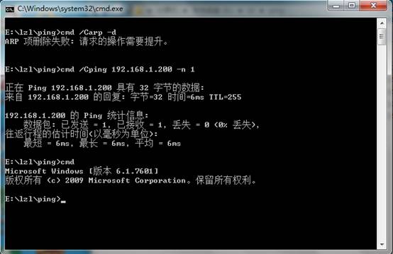 除了ZLPing以外還可以用windows自帶的命令arp -d來清空物理地址緩存。從這里下載pingbat.bat后雙擊即可運行一次清空物理地址緩存的操作。 正確的界面如圖2所示。