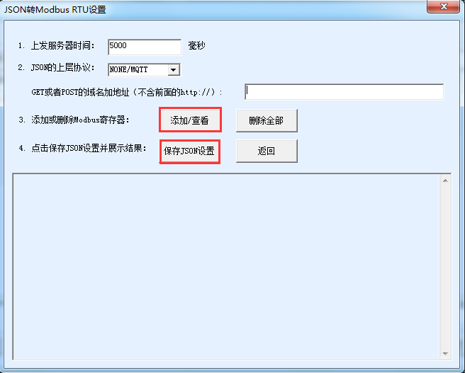 3.在這里選擇上發(fā)服務(wù)器的時間間隔,以及上發(fā)的方式,比如MQTT、POST、GET等,然后點擊“添加/查看”按鈕,設(shè)計每個JSON和對應(yīng)的Modbus寄存器。
