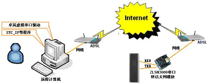 如圖所示是通過Internet遠(yuǎn)程升級STC單片機(jī)程序的演示圖。在設(shè)備端,使用卓嵐ZLSN3000模塊將STC單片機(jī)的串口(2根線)和ZLSN3000的RXD、TXD引線直接連接;ZLSN3000的網(wǎng)口連接到ADSL路由器。