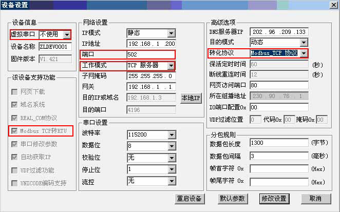 1.首先確認(rèn)該設(shè)備是支持Modbus TCP的2040產(chǎn)品。使用ZLVircom軟件,搜索并找到該設(shè)備后,進(jìn)行設(shè)備編輯。確認(rèn)“該設(shè)備支持功能”中的Modbus TCP轉(zhuǎn)RTU左邊的勾已經(jīng)選上,表示該設(shè)備支持Modbus TCP轉(zhuǎn)RTU。如圖所示。