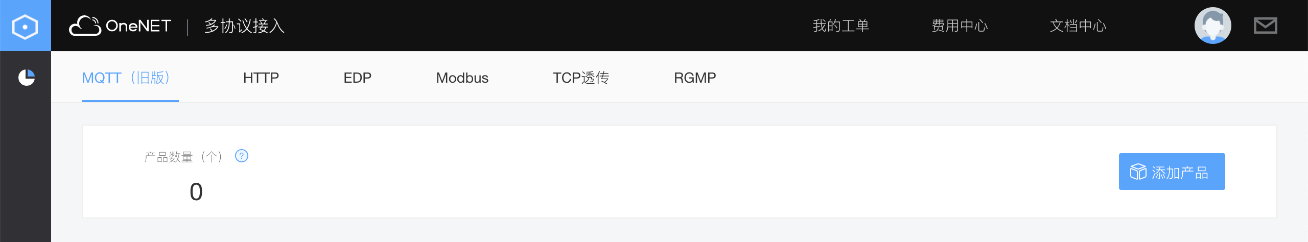 請(qǐng)登錄https://open.iot.10086.cn/,注冊(cè)O(shè)neNET賬號(hào)。注冊(cè)過程比較簡單這里就不再累述。登錄后進(jìn)入開發(fā)者中心,點(diǎn)擊左上角全部產(chǎn)品,全部產(chǎn)品多協(xié)議接入MQTT(舊版)。然后點(diǎn)擊“添加產(chǎn)品”。