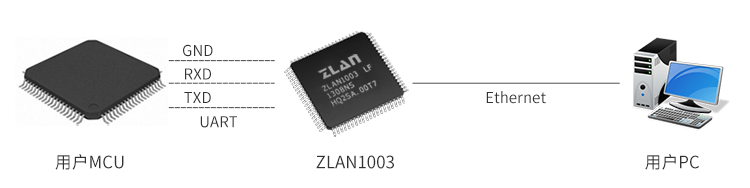 ZLAN1003系列芯片內(nèi)部程序無需用戶二次開發(fā),對接用戶MCU的UART直接收發(fā)數(shù)據(jù)即可將數(shù)據(jù)傳輸?shù)骄W(wǎng)絡上的計算機程序。用戶使用步驟大致如下:
