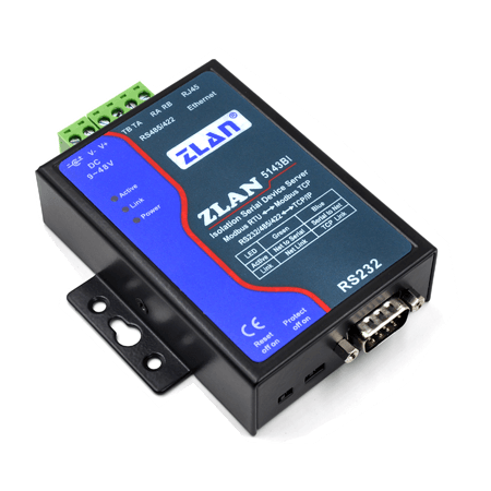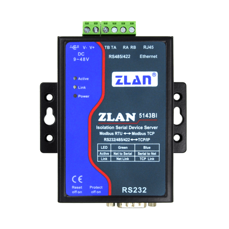 ZLAN5143BI是一款RS485/422串口帶隔離的串口服務(wù)器,可以有效的隔離RS485總線上的干擾對設(shè)備工作的影響,保證設(shè)備的穩(wěn)定性。適合于RS485總線有干擾的環(huán)境下使用。9~48V寬電壓。RS485/422支持256個負(fù)載。同時ZLAN5143BI也具有RS232接口,非光耦隔離。ZLAN5143BI的網(wǎng)口支持10M/100M自適應(yīng)網(wǎng)絡(luò)??梢詫崿F(xiàn)TCP/IP協(xié)議到RS485/422/232的轉(zhuǎn)化,方便通過網(wǎng)絡(luò)對串口設(shè)備進(jìn)行數(shù)據(jù)采集。網(wǎng)絡(luò)端可以使用虛擬串口連接串口軟件或者直接TCP/IP通訊的軟件。