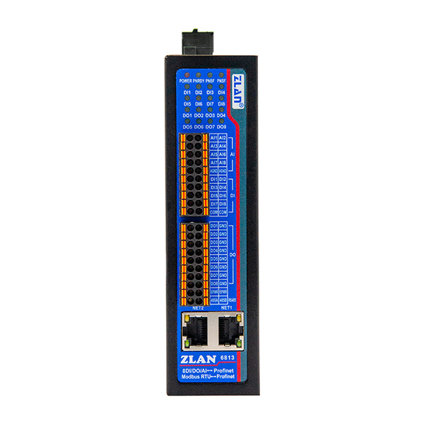 ZLAN6813是上海卓嵐繼Modbus IO控制器ZLAN6808系列后新推出的一款Profinet協(xié)議的IO控制器,其核心功能是通過Profinet協(xié)議讀取DI開關(guān)量狀態(tài)、AI模擬量數(shù)值以及控制DO開關(guān)量輸出。ZLAN6813同時還支持一路RS485接口,可以接入Modbus RTU從站實現(xiàn)Profinet和Modbus RTU兩種協(xié)議的轉(zhuǎn)換。我司提供專用的GSDML文件,便于用戶將ZLAN6813 與上位機(jī)進(jìn)行組態(tài)操作。