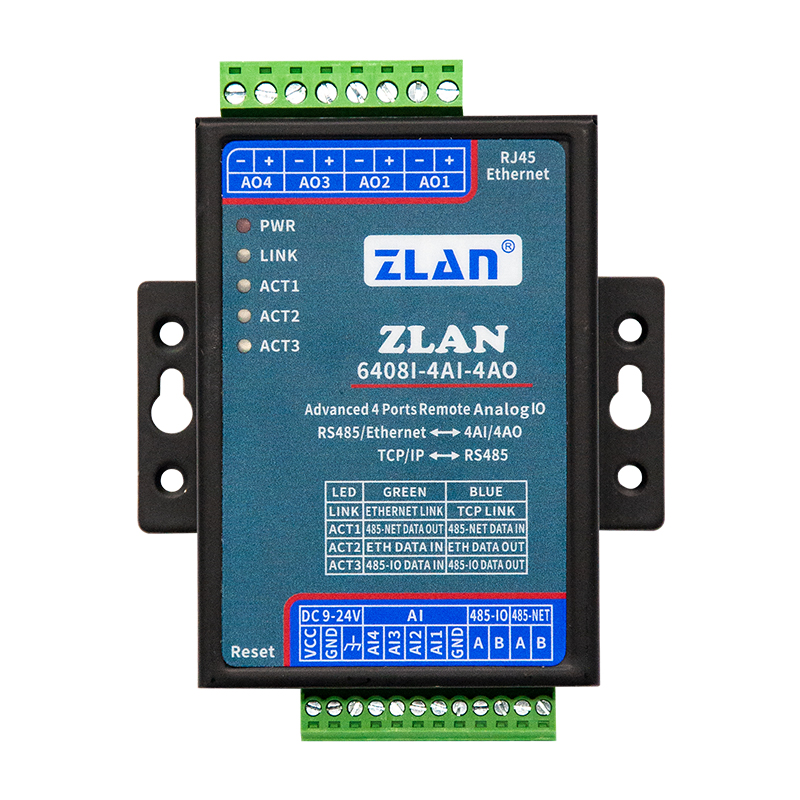 4路產(chǎn)品包含有4路DI、4路DO、2路AI。2路,AI可以為4~20mA的電流量或者0~5V、0~10V(可選)的電壓量。8路產(chǎn)品包含有8路數(shù)字量輸入、8路繼電器輸出、8路模擬量輸入,前4路AI為0~5V電壓量輸入,后4路AI為4~20mA電流量采集。