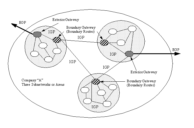 It is possible for a large autonomous system to be composed of several subnetworks or areas, each of which communicates with the other areas through an IGP. Each subnetwork or area has a designated gateway, called a border gateway, or border router, to indicate that it is within an area. Border routers communicate with each other using IGP. A commonly encountered term is boundary gateway, which is the same as an exterior gateway or a path to another autonomous network. This is illustrated in Figure 5.1, which shows three subnetworks or areas that communicate with each other through boundary gateways or routers using IGP, and two exterior gateways (also called boundary gateways) that communicate with the rest of the internetwork using EGP.