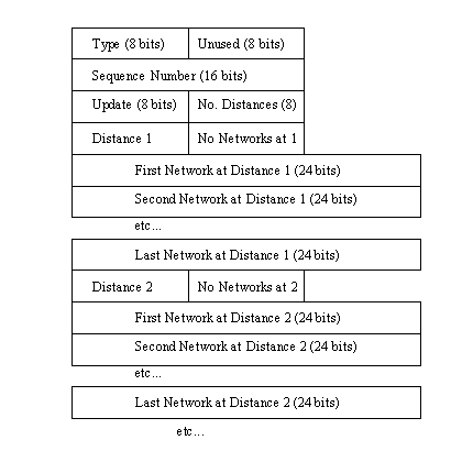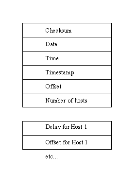 Following the header are several entries with a delay estimate to the machine and an offset, which is an estimate of the difference between the sending and receiving clocks. The offsets are important because HELLO is a time-critical protocol, so the offset enables correction between times on different machines.
